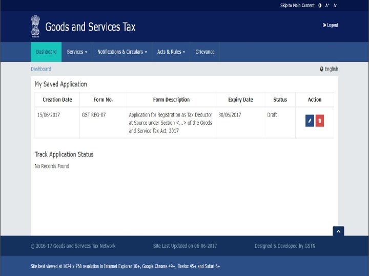 Procedure for registration ØOnline Application at GSTN (GST REG-07) ØGSTIN by TAN (Income Tax) and DSC/Aadhar ØApproval within 3 common working days ØNo query will be made by proper officer ØCertificate download (GSR REG-06) Login Øwww. gst. gov. in