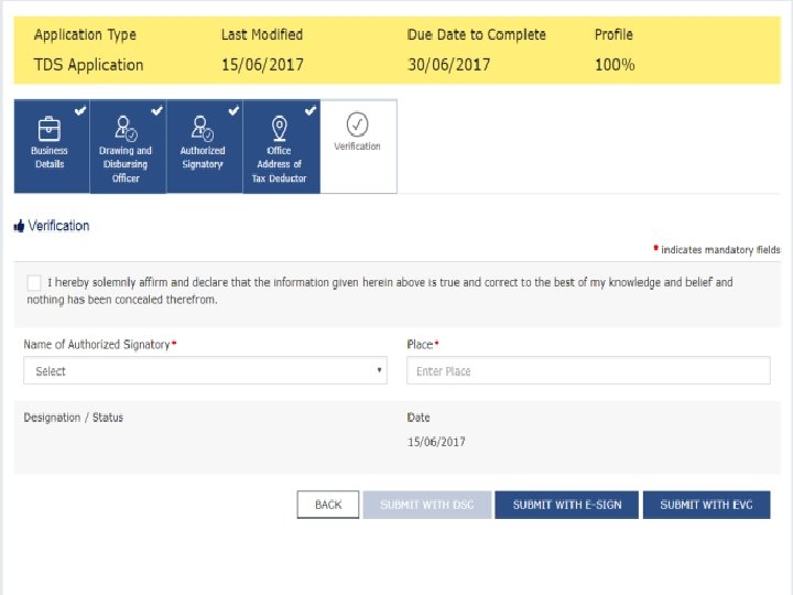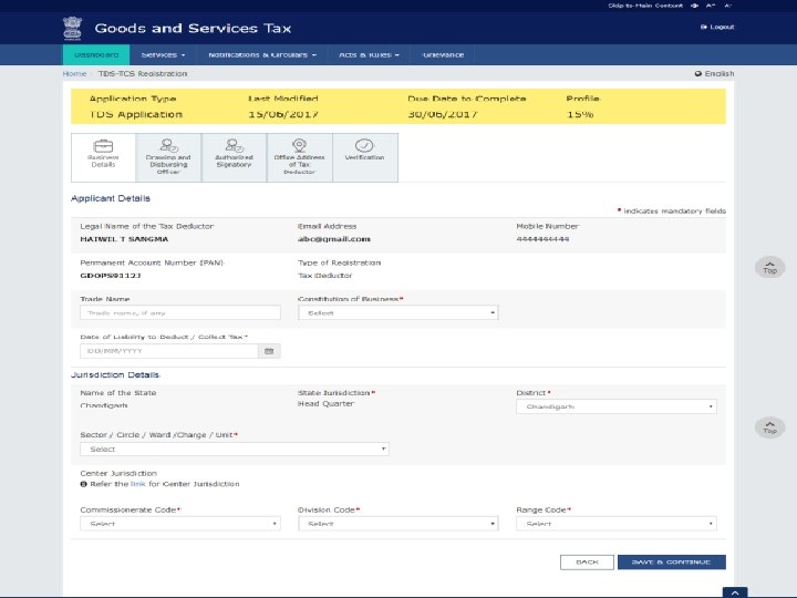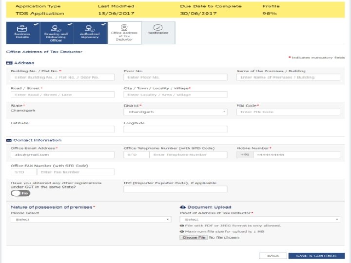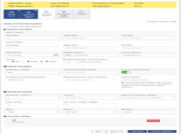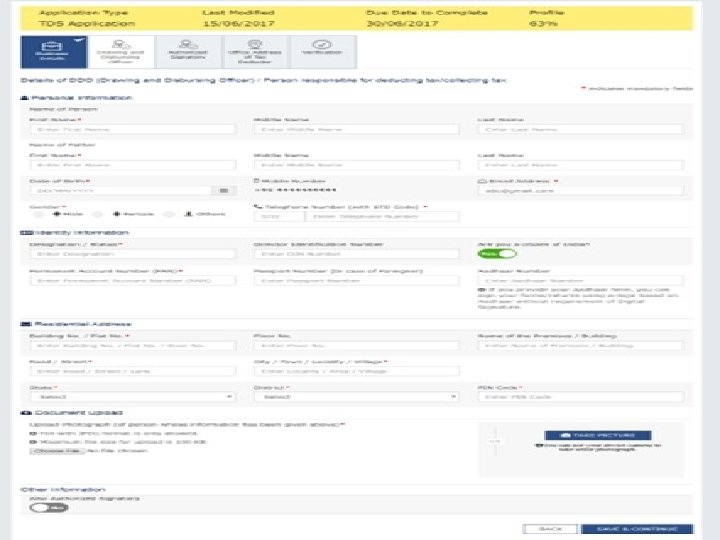 Instruction for filling Application for Registration as Tax Deductor Ø Enter Name of Tax Deductor as recorded on TAN/ PAN of the Business. TAN/PAN shall be verified with Income Tax database. Ø Provide Email Id and Mobile Number of DDO (Drawing and Disbursing Officer) / Person responsible for deducting tax for verification and future communication which will be verified through One Time Passwords to be sent separately, before filling up of the application. Ø Person who is acting as DDO/ Person deducting tax can sign the application Ø All information related to PAN, Aadhaar, DIN, CIN shall be online validated by the system and Acknowledgment Receipt Number will be generated after successful validation of all the filled information. Ø Status of the online filed Application can be tracked on the Common Portal.