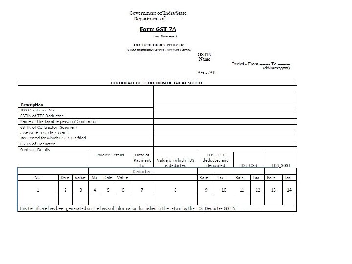 Payment and other Procedures ØPayment to be made through www. gst. gov. in ØPayment at GSTN before 10 th of next month ØCertificate(GSTR-7 A) to deductee within 5 days of filing of return in GSTR 7.
