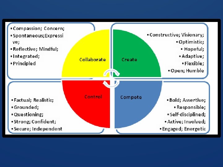 Collaborate Create Compete Control Self focused Internally closed Comfort Centred Externally Directed TO TO Other Focused Externally Open Purpose Centred Internally Directed