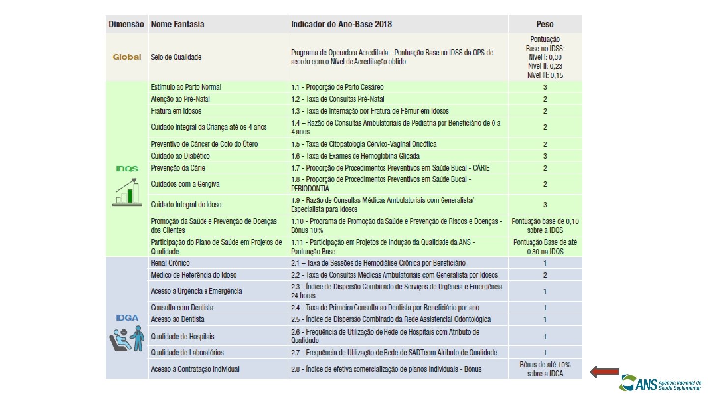 Lista de Indicadores: Ano-base 2019 INDICADOR BASE NO IDSS PESO Pontuação Base Programa de Operadora Acreditada - Pontuação Base no IDSS da OPS de no IDSS acordo com o Nível de Acreditação Nível I: 0, 30 Nível II: 0, 23 Nível III: 0, 15