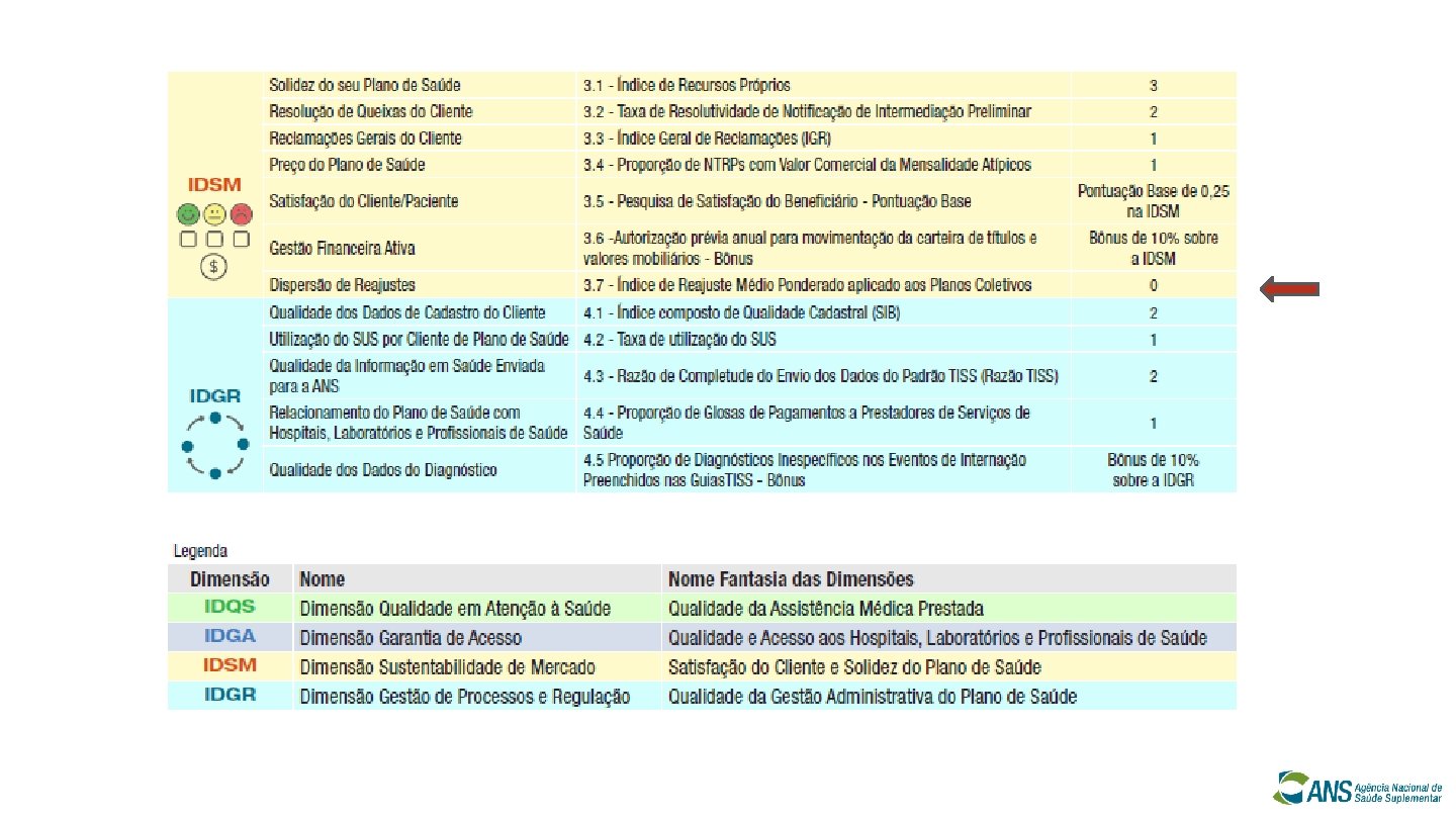 Lista de Indicadores : Ano-Base 2019 3 - INDICADORES DA DIMENSÃO SUSTENTABILIDADE NO MERCADO – IDSM 3. 1 - Índice de Recursos Próprios 3. 2 - Taxa de Resolutividade de Notificação de Intermediação Preliminar 3. 3 - Índice Geral de Reclamações (IGR) 3. 4 - Proporção de NTRPs com valor comercial da Mensalidade Atípicos 3. 5 - Pesquisa de Satisfação do Beneficiário - Pontuação base 0, 25 3. 6 -Autorização prévia anual para movimentação da carteira de títulos e valores mobiliários 3. 7 - Índice de Reajuste Médio Ponderado aplicado aos Planos Coletivos 3 2 1 1 Pontuação Base de 0, 25 IDSM Bônus de 10% IDSM 0
