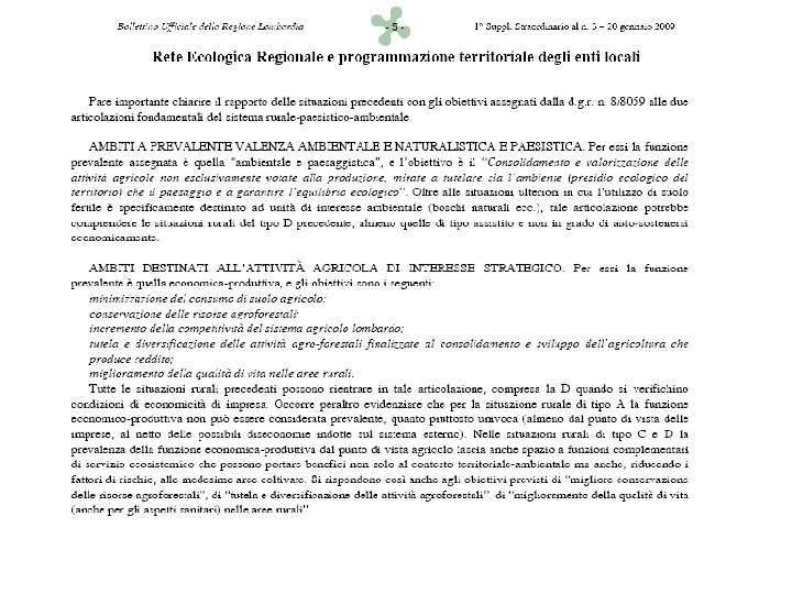 I SERVIZI ECOSISTEMICI (punto 1. 3) Servizi ecosistemici di interesse per la realtà lombarda sono i seguenti: * stock di carbonio, e ruolo della riduzione dei gas-serra; * biomasse come fonte di energia rinnovabile, all’interno di una ripartizione equilibrata dei prodotti degli agroecosistemi (alimentari, energia, valori ecopaesistici); * ecosistemi filtro (autodepurazione, fitodepurazione) lungo i flussi di acque inquinate; * concorrenza alla difesa del suolo attraverso su versanti potenzialmente soggetti a rischi idrogeologici; * contributo al paesaggio con nuclei ed elementi vegetali concorrenti ad assetti formali percepibili come positivi sul piano culturale o genericamente estetico; * miglioramento dei flussi di aria inquinata in ambito urbano o periurbano, quali quelli derivanti da strade trafficate o da sorgenti produttive, in modo da svolgere funzione di filtro sul particolato trasportato; * opportunità specifiche di recupero di ambienti a vario titolo degradati (attività estrattive, cantieri, smaltimento rifiuti, bonifica di suoli contaminati, controllo di specie aliene e comunque indesiderate ecc. ); * tamponamento del microclima negli insediamenti abitati.