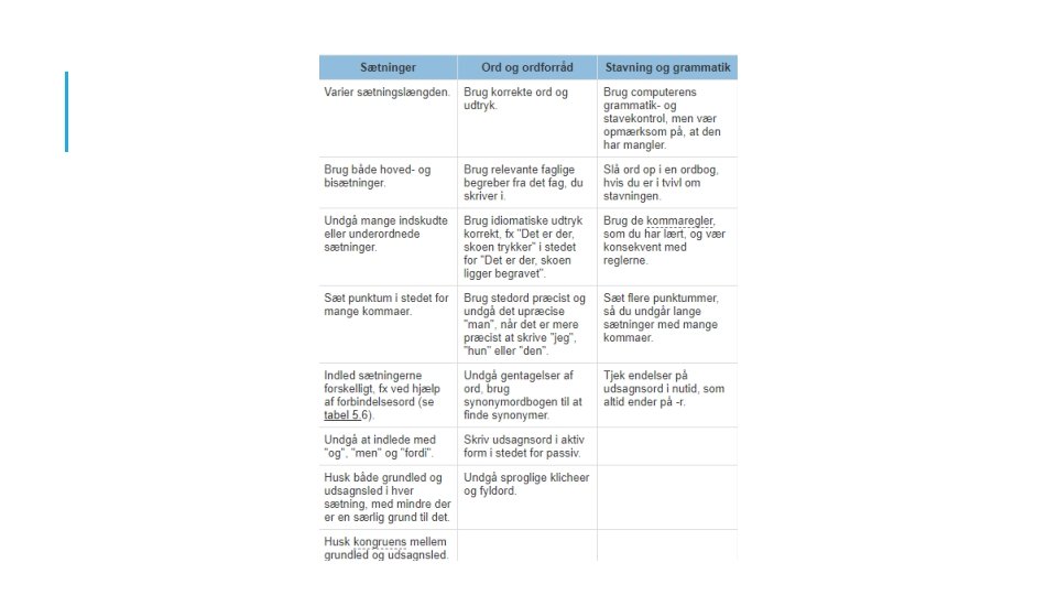 Korrekt: Grammatik, stavning, tegnsætning Sagligt: Hverken talesprog eller kancellisprog, men skriftsprog. Præcist: Bruger faglige begreber. Indeholder intet overflødigt