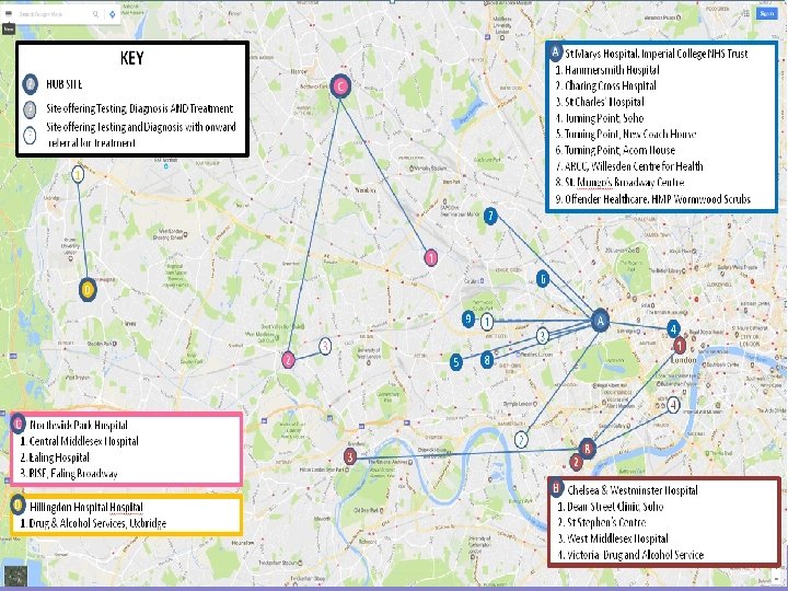 Discussion: Drawing on the data that is available, how can we improve data linkage of hepatitis C databases across London? Ø Sexual Health clinics are receiving patients already and this is a way to access testing and referral. - they have the resources, the skill set and capacity, however the service is anonymous so cannot share data. Ø Commissioner: the funding for substance use in Local Authority causes problems. - payment by results, not block payments, cuts within sexual health, cuts in drug services, so no money for improving data bases and linkage programmes. Ø STHep. Net – mapping GP’s testing for HCV by postcode, identified big gaps in South London, so mapping on a wider scale could be useful for London.