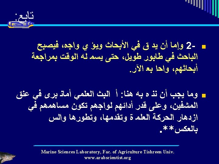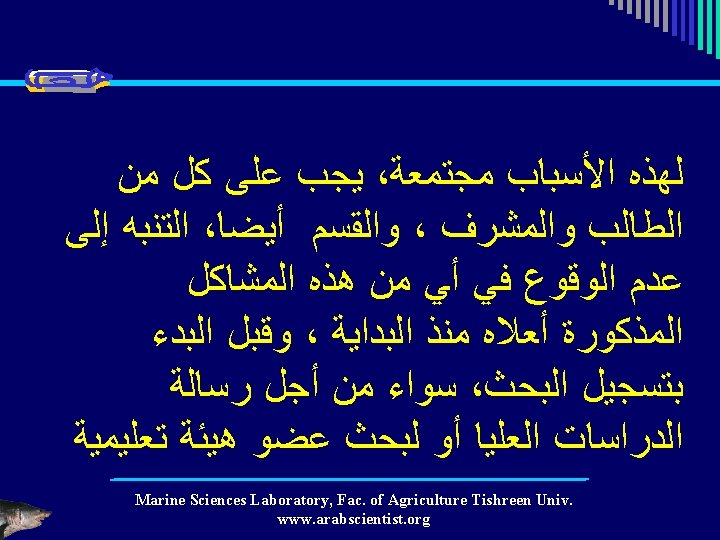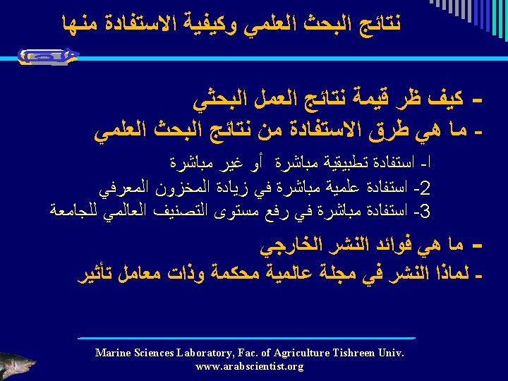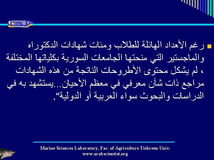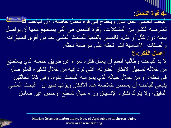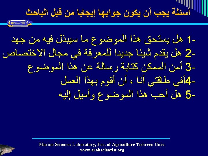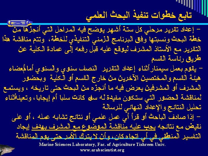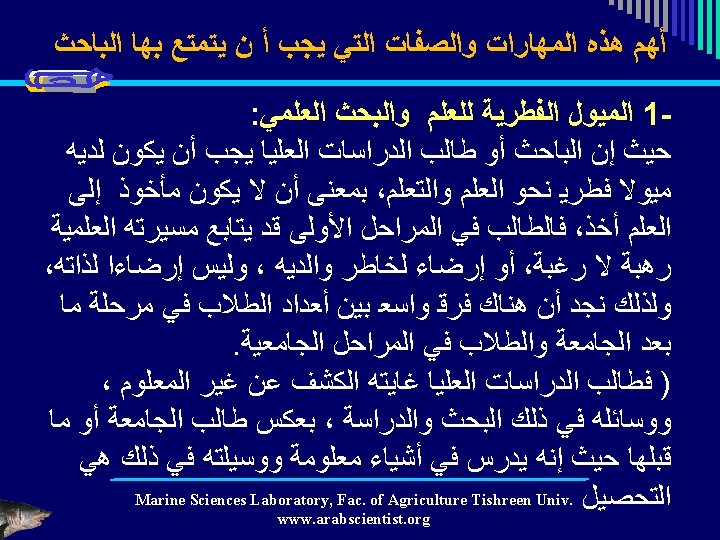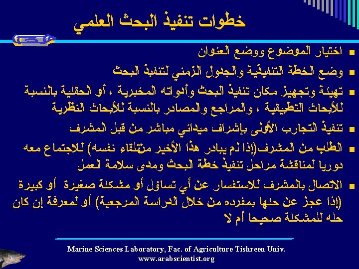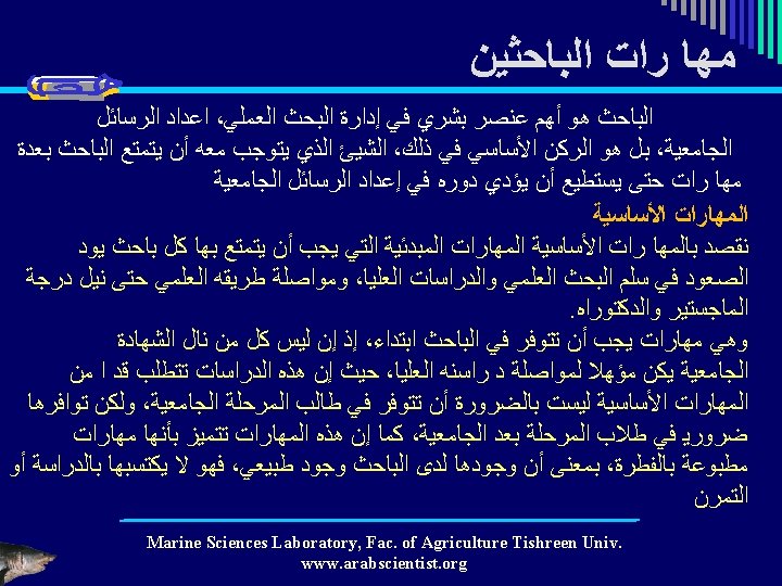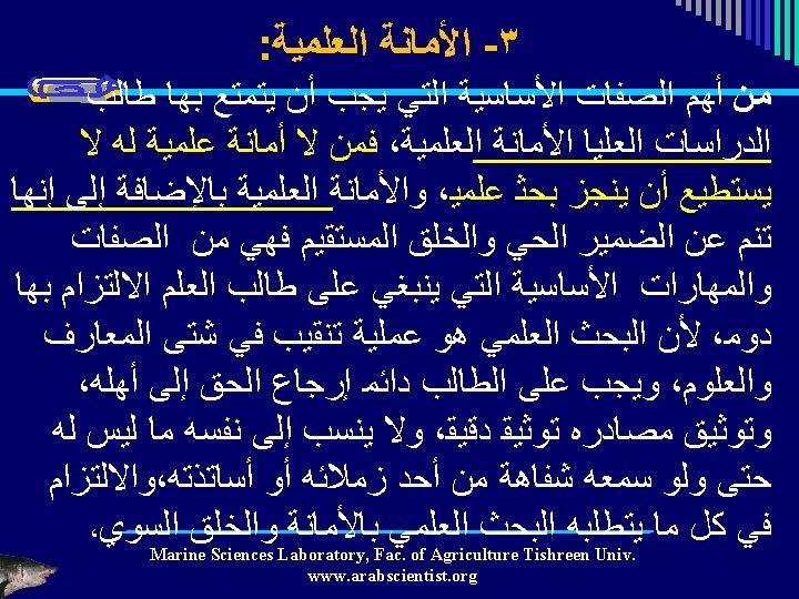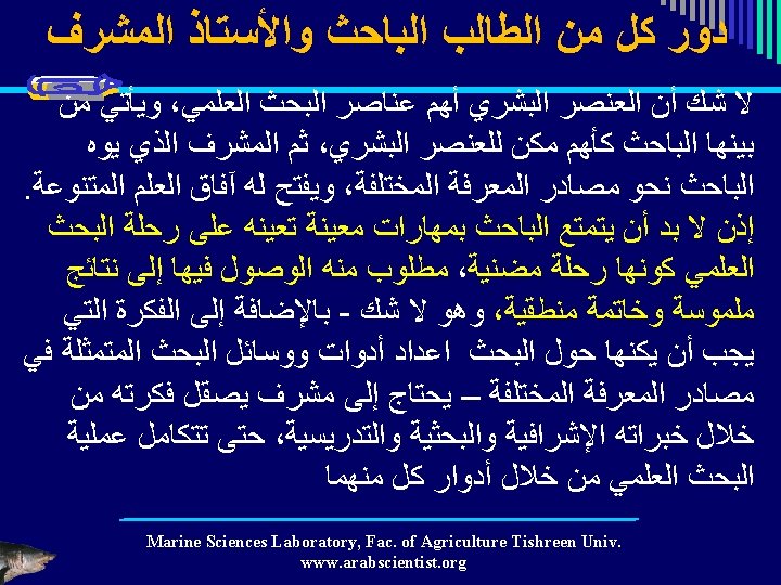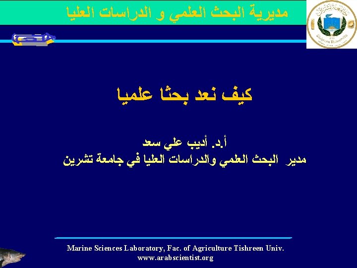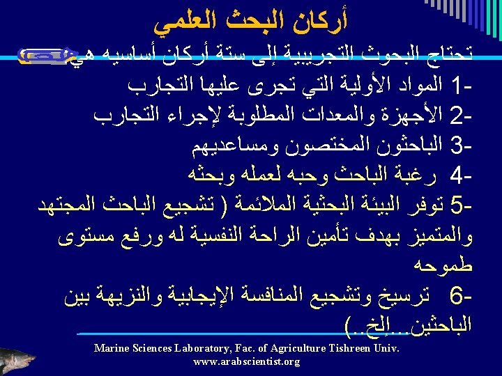ﻹﺻﻐﺎﺋﻜﻢ ﺷﻜﺮ ﻭﻣﺘﻤﻴﺰ ﻧﺎﺟﺢ ﻋﻠﻤﻲ ﺑﺒﺤﺚ ﺍﻟﺘﻤﻨﻴﺎﺕ ﻣﻊ Marine Sciences Laboratory, Fac. of Agriculture Tishreen Univ. www. arabscientist. org