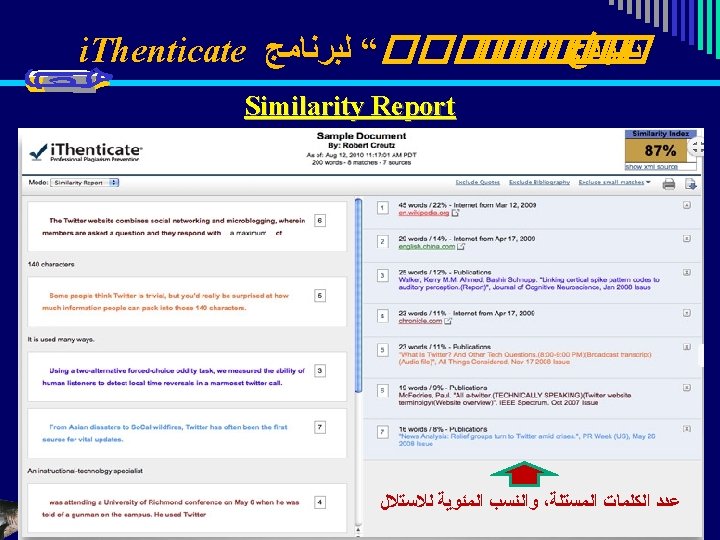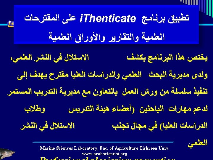 ﺑﺎﻟﺘﺤﻘﻖ i. Thenticate ﺍﻻﺳﺘﻼﻝ ﺍﻟﻤﻌﺮﻭﻑ ﺑـ : ﺧﻼﻝ ﻗﻮﺍﻋﺪ ﺑﻴﺎﻧﺎﺕ ﻛﺒﺮﻯ ﻣﺜﻞ ﻳﻘﻮﻡ ﺑﺮﻧﺎﻣﺞ ﻣﻦ ﺍﻟﻮﺭﻗﺔ ﺍﻟﻌﻠﻤﻴﺔ ﺍﻟﻤﻜﺘﻮﺑﺔ ﻣﻦ ACM, BMJ Publishing Group, Elsevier, IEEE, Nature Publishing Group, Oxford University Press, Sage, Informa UK (Taylor & Francis), Wiley Blackwell, Springer, Sage, Am. Institute of Physics, Am. Physical Society, Am. Psychological Society, AAAS ﻭﻳﻘﺪﻡ ﺍﻟﺒﺮﻧﺎﻣﺞ ﺗﻘﺎﺭﻳﺮ ﻣﺘﻌﻤﻘﺔ ﻓﻲ ﻏﻀﻮﻥ ﺩﻗﺎﺋﻖ ﻟﻀﻤﺎﻥ ﺃﺼﺎﻟﺔ ﺍﻟﻌﻤﻞ ﻗﺒﻞ ﺍﻟﻨﺸﺮ Marine Sciences Laboratory, Fac. of Agriculture Tishreen Univ. www. arabscientist. org