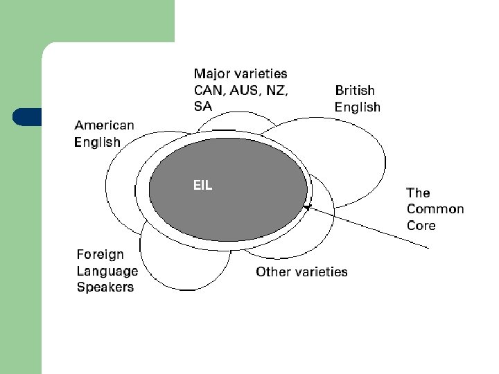 The English Today debate l l l Englishes Outer Circle Englishes still regularly regarded as Interlanguage: learner language which has not yet reached the target Fossilized language: language used when learning has ceased short of native-like competence Expanding Circle Englishes even less accepted