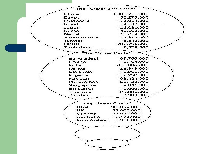 Three circle model of World Englishes Kachru (1992: 356) l Most useful and influential model l World Englishes divided into 3 concentric circles: 1. Inner Circle: ~ ENL countries, ‘norm-providing’ 2. Outer Circle: ~ ESL countries, ‘norm-developing’ 3. Expanding Circle: ~EFL countries, ‘norm-dependent’