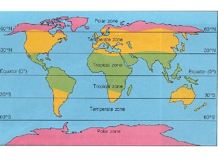 Latitude, Elevation and Climate • Low Latitudes – Between 30°South and 30°North – Tropic of Capricorn, Equator, Tropic of Cancer are in this zone …sun all year = Warm to hot • High Latitudes – Between 60°North and 90°North and between 60°South and 90°South – Arctic/Antarctic circle- direct sunlight 180 days