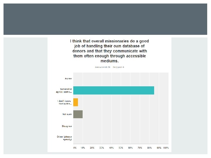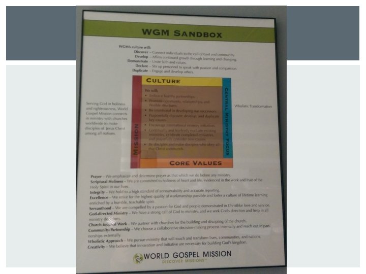 World Gospel Mission Communication Audit PREVIEW Culture Systems Slides: 43 Download presentation World Gospel Mission Communication Audit PREVIEW Culture Systems Internal & External Recommendations BUILDING World theme Open area Chapel area BECOMING A MISSIONARY Paperwork References Evaluations MIT required CULTURE SANDBOX Employees used to different cultures Tuesday-chapel Urgent info shared VP responsibility Thursday-department prayer meeting CHAPEL AREA CULTURE Results only Culturally sensitive CULTURE Leadership Development Lunches Support staff party “Gathering Week” Regional celebration Global celebration every 5 years 105 years DONORS Financial/prayer Donations-HQ Blog/Facebook DONORS Goal: connect with magazine MISSIONARIES Communication- issue based Business oriented Time zones Field directors INTERNAL Intranet Master calendar Performance reviews Handled by VPs Same template SANDBOX performance reviews INTERNAL QUESTION 5 INTERNAL Missionaries do annual review Specific to field Accountability QUESTION 9 EXTERNAL STRUCTURE 3 regions 1 coach/region Main contact Field director-regional directorheadquarters INTERNAL ISSUES Delayed response from missionaries Structure Repetition in information QUESTION 3 EXTERNAL ISSUES Branding § Logo required on blogs § Not Facebook SOCIAL MEDIA Master schedule Refer to website Pictures Media savvy WEBSITE FACEBOOK TWITTER RECOMMENDATIONS Relevancy Repetition Branding METAPHOR