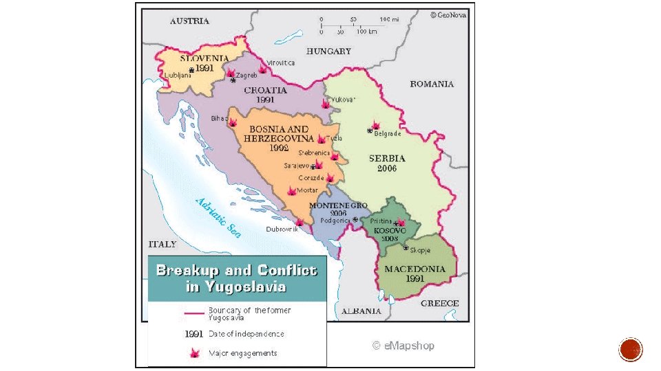 § In June 1991, both Slovenia and Croatia declared their independence & the Serb-dominated Yugoslav army attempted to stop them an keep the country together § Militias were formed to defend the newly proclaimed nations & various ethnic communities armed themselves and dug into defensive enclaves. § The fighting raged throughout 1991, killing thousands of soldiers and civilians. § By the end of 1991 it was clear that the Serbian government had failed to prevent the breakup of Yugoslavia, it was determined to prevent the separation of Bosnia-Hercegovina