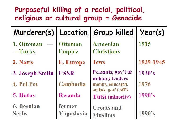 Genocide: the systematic attempt to eliminate a group of people from the face of the earth The map to the right and the next slide show other examples of genocide