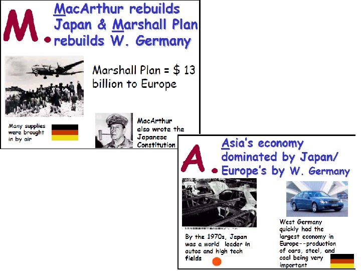 Marshall=MONEY Marshall Plan (1947) • United States offers financial aid to Europe • Eastern Europe refuses (why? !) • Rebuilds Western European economies – Stop spread of communism through “friendship” (how? !) What does this cartoon mean?