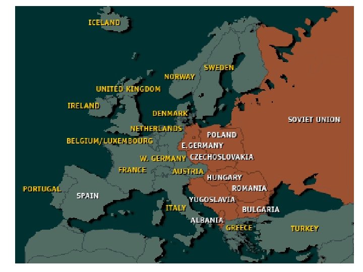 Eastern and Central Europe • Stalin promised “free” elections in Eastern and Central Europe at Yalta in 1945 • Post-War – Occupied by Soviet Union • After elections all become communist – Satellite Nations Puppets controlled by Soviet Union – “Iron Curtain” – nicknamed by Winston Churchill in a famous speech