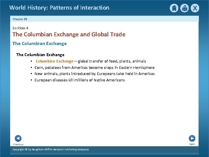 World History: Patterns of Interaction Chapter 20 Section-4 The Columbian Exchange and Global Trade The colonization of the Americas introduces new items into Eastern and Western hemispheres. Previous Copyright © by Houghton Mifflin Harcourt Publishing Company Next