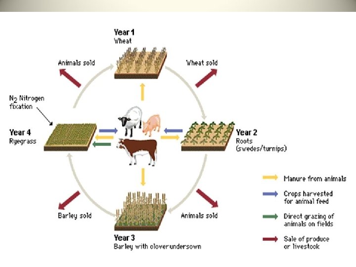 Charles “Turnip” Townshend • Was a Whig MP – Chancellor of the exchequer for 10 years • Retired from politics 1730 – got in to experimental farming • Experimented with crop rotation: turnips and clover, instead of letting the land fallow • Huh? What am I talking about? • Clover replenished soil – what “need” will this eliminate? • Turnips were “fodder” crops – what will they now be able to do? – Now could keep animals alive through winter, especially cows