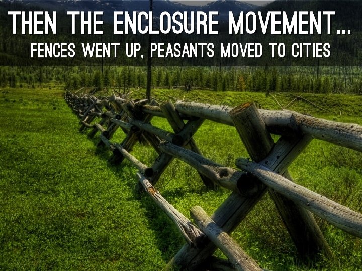 Enclosure Movement • Wealthy landowners were ready to invest in sheep raising – for what? • Increased population needed more clothing – How will sheep play into this? • Landowners bought out strips from peasants • They then “enclosed” land for “improvement” • What was being improved? • Who will benefit? • Who will not? • What will happen next?