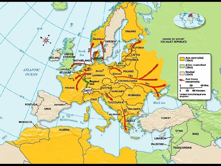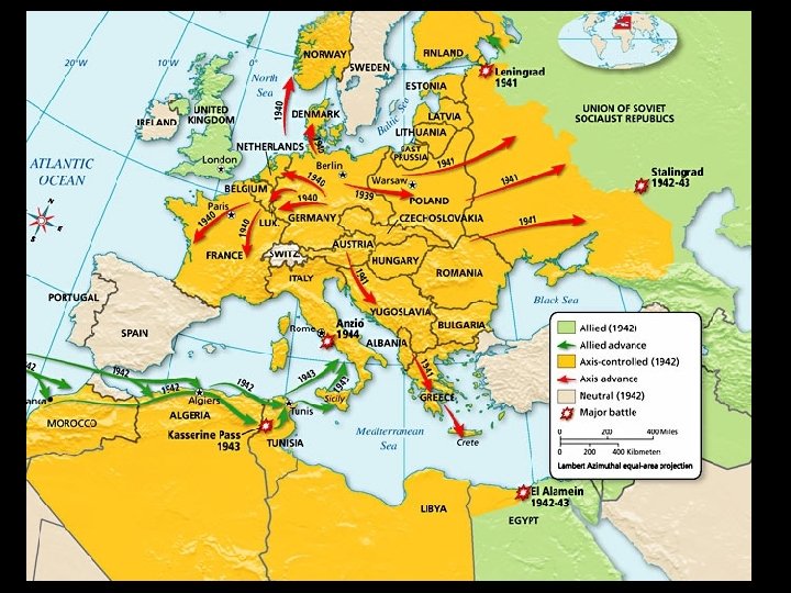 E. Japan 1. Fascist military has taken over the gov’t 2. Has very few natural resources F. Operation Orient 1. Axis Powers’ plan to conquer the world 2. 1935 – Italy annexes parts of N Africa 3. 1937 -- J annexes Manchuria, China 4. 1940 – G annexes Netherlands, Bel, Fr 5. 1940 - Battle of Br continues 6. 1941 – J annexes Indochina 7. USSR next?