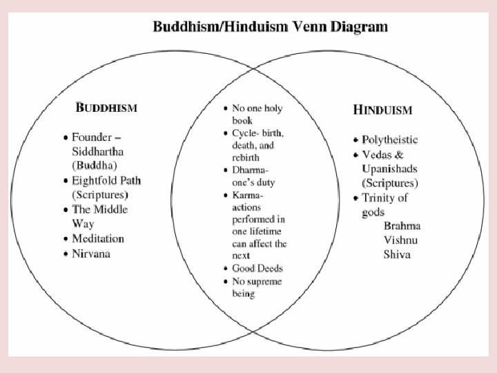 Basic Beliefs of Hinduism • Souls are reincarnated after death • Ultimate goal is to escape the cycle of rebirth and become one with Brahman (known as Moksha) • Major Ideas – – Dharma (duty) Karma (action) Samsara (cycle of life) Moksha (liberation) Kali, goddess of death and destruction