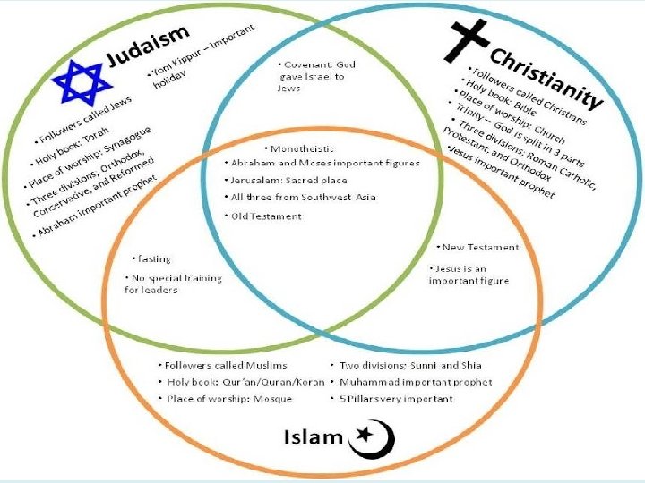 Abrahamic Religions • The three “great” monotheistic religions of today all share common origins • All share the same founding figure of Abraham, or pay reverence to him • All share basic core tenets (beliefs), including central figures, prophets, writings, etc. • All worship the same God