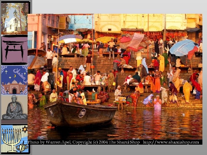 • • Varanasi on the Ganges River is the holist city in Hinduism and is over 3, 000 years old. As the sun rises each day worshipers come to the ghats (steps) to perform rituals, such as washing themselves, drinking the river water, and making floating offerings. To die here is to be released from the cycle of life -- from reincarnation and reborn. If possible, Hindus want to die here, and then be burned on one of two funeral ghats -- which are clearly identified by the large piles of firewood. www. uwec. edu/. . . /India/Varanasi-ghats. htm