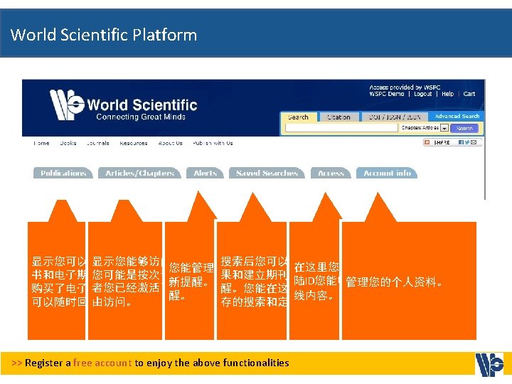 World Scientific Platform The new World Scientific platform was launched in July 2012. The main aim was to integrate over 5, 000 e-book titles and 120 journals onto one single platform. 搜索我�所有的� �、期刊和�子�。 >> All our E-Books and journals are in PDF format and accessible through www. worldscientific. com