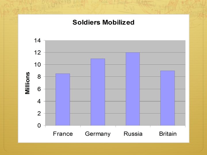 A European War Russia began to mobilize Supported Serbia and Pan-Slavism France began to mobilize to support Russia Germany gave Russia and France an ultimatum = stop mobilizing or face war They didn’t stop Germany declared war on Russia and France Great Britain tried to stay neutral