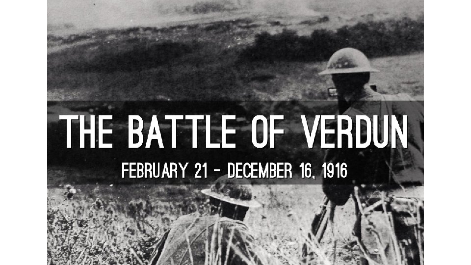 • Longest battle of the war • 700, 000 casualties (dead, wounded and missing) • Fought along 6 miles of land in eastern France that had about 60 forts (big and small) for protection. • If France lost this, then all of France would fall • Germany started the attack with 140, 000 troops – 2, 500, 000 shells launched from artillery guns along with 168 plains. France had 30, 000 men for defense. • Because it didn’t seem as if it would end, the British start another battle a few miles away • The German plan was to “bleed France”