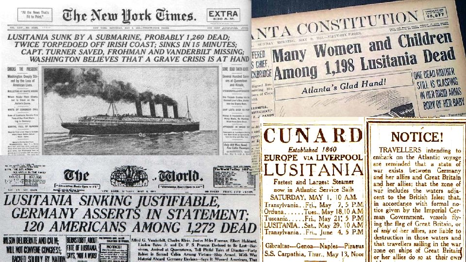 How does the US get involved in the war? Two reasons --1. The sinking of the Lusitania. • When – May, 1915 • Where – off of the southern coast of Ireland • Who was on board – mostly Irish – mainly poor. • Why was it sunk? Germany had declared UNRESTRICTED SUBMARINE WARFARE which means that they would sink ANYTHING in the water. • So - Germany thinks the US is sending weapons to their friends – the Brits. • Are we? Yes. Did we ever admit it? No. (not until recently when the ship remains were found) Did that make it ok to sink a cruise ship. NO. • Our president, Woodrow Wilson, issued a statement against the tragedy and Germany but did nothing else.