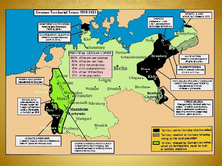 Treaty of Versailles 2) Colonial Provisions - Germany had to give up all of its overseas colonies to the Allies - Great Britain & France split Germany’s colonies in Africa - Australia took German Pacific islands south of the Equator - Japan took German Pacific islands north of the Equator
