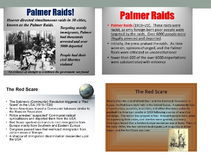 POSTWAR TROUBLES • Labor Unrest • During the war, unions and businesses had cooperated to meet production goals. • Peacetime brought high unemployment, as soldiers came home to seek jobs. • With prices rising, unions’ demands for higher wages met stiff resistance from management. • Red Scare • Many Americans feared that Communists, or “Reds, ” were behind the labor unrest. • From 1919 into 1920 a “Red Scare, ” or fear of Communist revolution, gripped the nation.