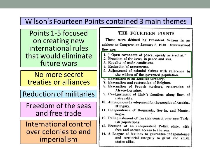 WILSON’S PLAN FOR PEACE • Wilson outlined his peace plan into the Fourteen Points to prevent another World War from occurring. • There were three (3) main ideas that the 14 Points represented. • The causes of the war • Territorial issues • Creation of an international peacekeeping body • What were some of his points? 1. End to Alliances 2. Freedom of the seas 3. Limit on Arms (weapons) 4. Self-determination: the right of national groups to their territory and forms of government.