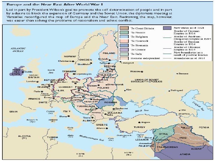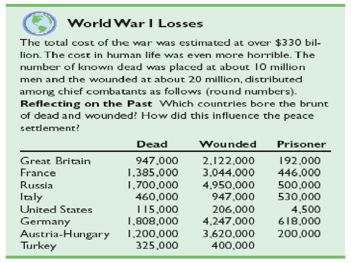 The Cost of War • 8 to 9 million Europeans died in battle • 50, 000 Americans died in battle • More than 20 million soldiers on both sides were wounded • Northern France was in ruins • Millions of Germans were near starvation • Many European children were left orphaned and homeless • Flu epidemic killed more than 20 million people worldwide. (Twice as many as the war itself)