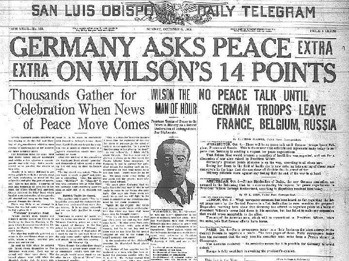 Wilson’s Fourteen Points PRINCIPLES: 1. Freedom of the Seas 2. Reduction of Arms 3. Open Treaty Negotiations 4. Self Determination of Peoples 5. League of Nations 14
