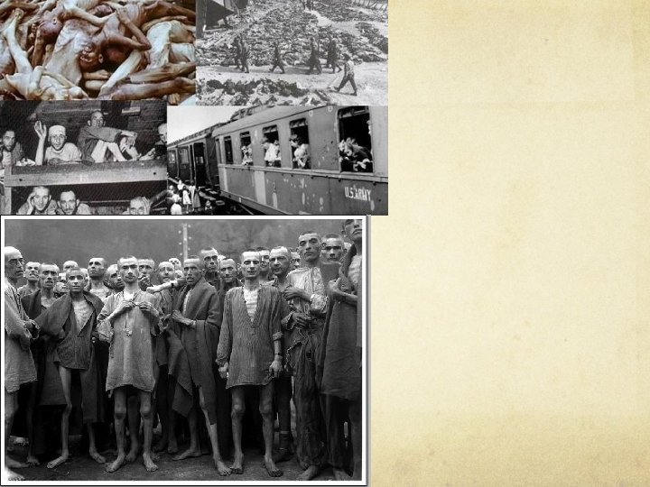 The Holocaust refers to the attempted genocide of the Jews in Europe during World War II. Genocide is an effort to murder an entire people or nationality. The Final Solution- was Hitler’s plan to execute all European Jews under the cover of the war. Concentrations Camps- They were built all over Europe. Jews from throughout Nazi – controlled Europe were sent to these camps in cramped railroad cattle cars. Babies were used as target practice and there was a German doctor on site to determine whether a person was eligible to work or not. If they were not they were gassed and burned. These inmates were half- starved and subjected to inhumane conditions. Human Toll- Estimated 6 million Jews, two-thirds of those living in Europe were killed in the Holocaust. Six million gypsies, Slavs, political prisoners, elderly and mentally disabled people also dies in Nazi concentration camps.
