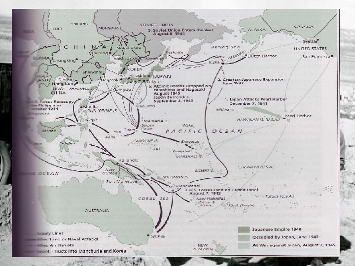 XV. The Battle of Midway & the Pacific Midway Island, June 1942 was the turning point in Asia U. S. destroyed Japanese aircraft carriers & navy Fall 1942, U. S. general Douglas Mac. Arthur began “island hopping” up to Japan
