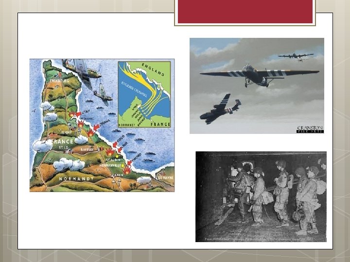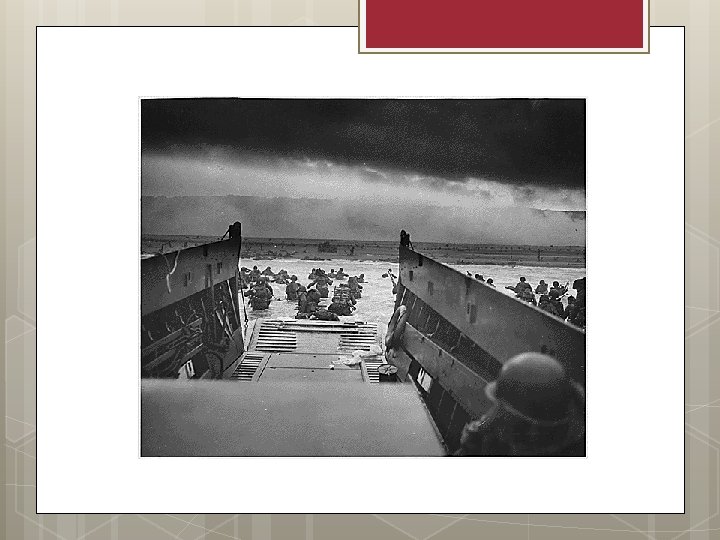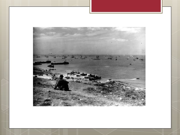 D-Day June 1944 Know as the beginning of the end of the war in Europe Officially called Operation Overlord Included naval bombardment before the battle, and an airborne and amphibious assault on the Normandy region in France 160, 000 Allied troops participated in the attack and there were over 10, 000 casualities Within one year the Germans were defeated and the war was over