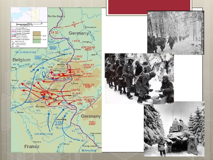 Battle of the Bulge December 1944 Last major German attack of the war Hitler wanted to stop the Allied advance and take the supply port at Antwerp, Belgium Attack took the Allies by surprise Weather kept the Allied air force from helping during the battle Largest battle that American troops participated in during the war (600, 000 soldiers) Attack failed because the Germans ran out of gas, literally