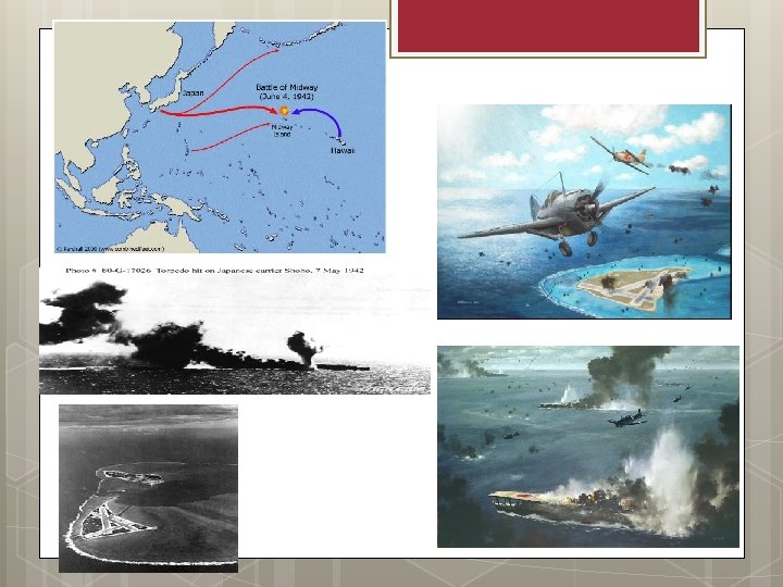 Battle of Midway June 1942 Midway Island was home to an important American airfield Americans knew Japanese were coming they had broken their code American were outnumbered four ships to one Japanese wanted to destroy the American fleet American navy sank four. Japanese aircraft carriers and crippled the Japanese navy for the rest of the war