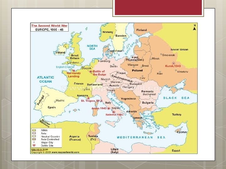Overview Fought from 1938 -1945 Involved soldiers from over 56 different countries There were over 60 million causalities (2. 5% of the worlds population) The United States entered the war in 1941 Over 6 million Jews were killed by the Nazis during the war The main ALLIED powers-Great Britain, the U. S. , France, and the Soviet Union Main AXIS powers- Germany, Italy, Japan