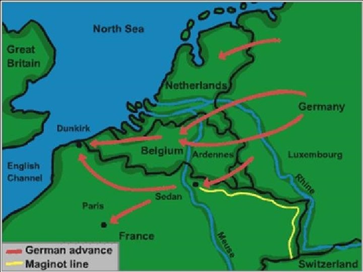 Fall of France Germany worked its way around the Maginot Line: – Invasion of Belgium gave them access – Ardennes Forrest – Britain and France thought it was impossible to attack through.