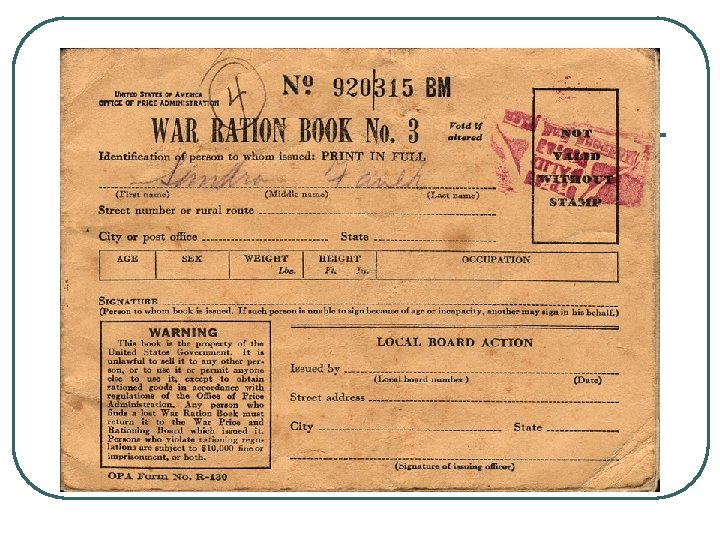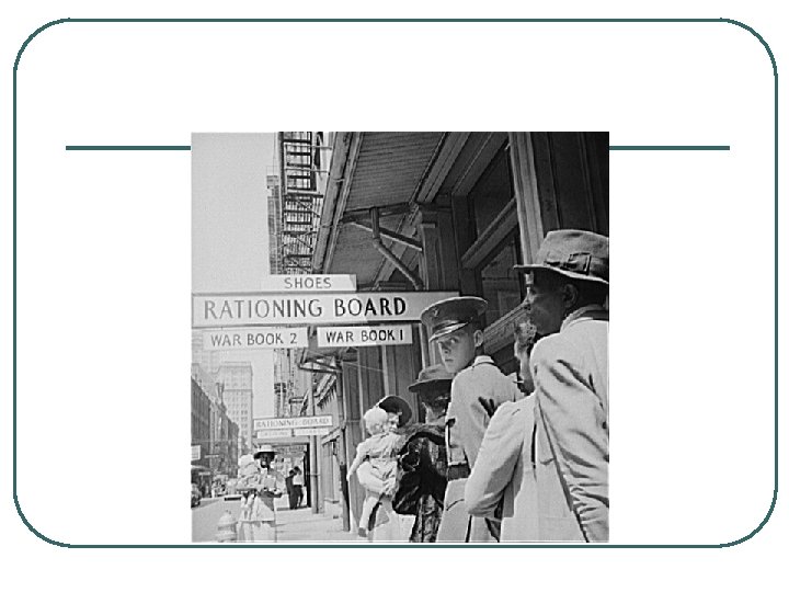 1. RATIONING l l 1. Rationing is the controlled distribution of resources and scarce goods or services. 2. Example of wartime conservation 1)Each household received a “C-Book” with coupons to be used when buying scarce items (meat, sugar, coffee) 2)Gas rationing