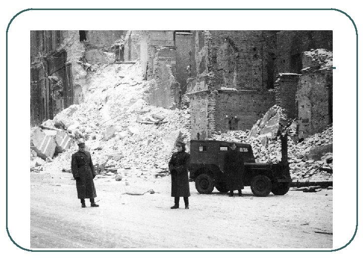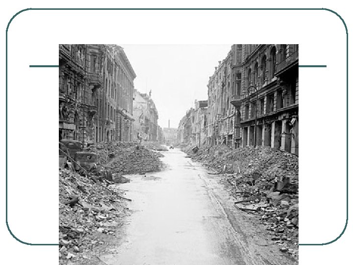 RESULTS OF WORLD WAR II l l l l 1. AXIS DEFEAT 2. DESTRUCTION, DEVASTATION, LOSS OF LIFE 3. HOLOCAUST 4. UNITED NATIONS 5. RISE OF SUPERPOWERS, USA, USSR 6. COLD WAR 7. DIVIDED GERMANY 8. NUCLEAR AGE