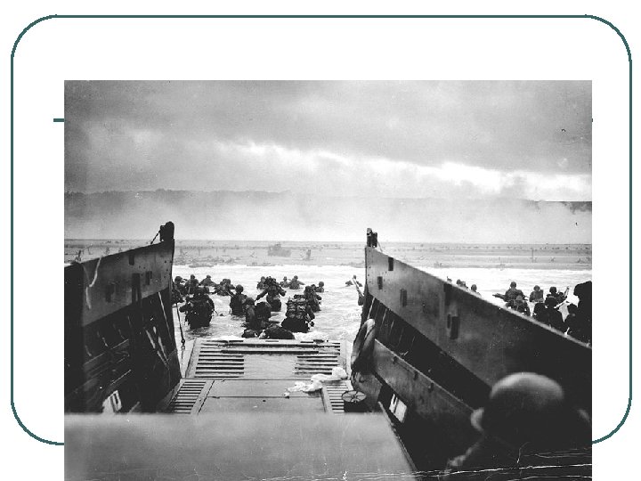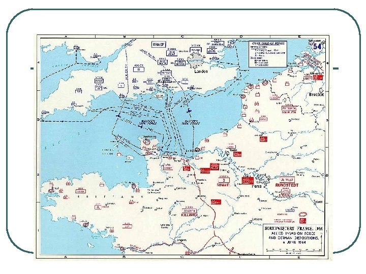 MAJOR EVENTS OF WORLD WAR II, BATTLE OF NORMANDY l l l 1. NAME: OPERATION OVERLORD, CODE NAME, DDAY, JUNE 6, 1944 2. ALLIED INVASION OF GERMAN-NAZI OCCUPIED NORTHERN FRANCE 3. LARGEST SEA INVASION IN HISTORY, 156, 000 MEN, 6939 VESSELS 4. SURPRISE FOR GERMANS WITH MANY ALLIED LOSSES 5. US, CA PUSH GERMANS E. TO GERMANY 6. RESULT: BEGINNING OF ALLIED VICTORY IN EUROPE