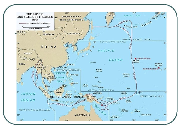 MAJOR EVENTS OF WW II, BATTLE OF MIDWAY l l l 1. JUNE 4 -7, 1942, 6 MTHS AFTER PEARL HARBOR 2. TURNING POINT, USA DEFEATED JAP AT MIDWAY ATOLL IN PACIFIC 3. MORALE BOOST FOR USA, TAKE WAR TO HEART OF JAP