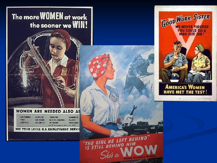 Women in WWII n n n Women responded to the urgent demand for their labor 5 million women entered the work force replaced the men who joined the armed services. n Married and single women worked as reporters, truck driers, factory workers and aircraft workers. They also typed telegrams and went overseas as nurses and pilots.