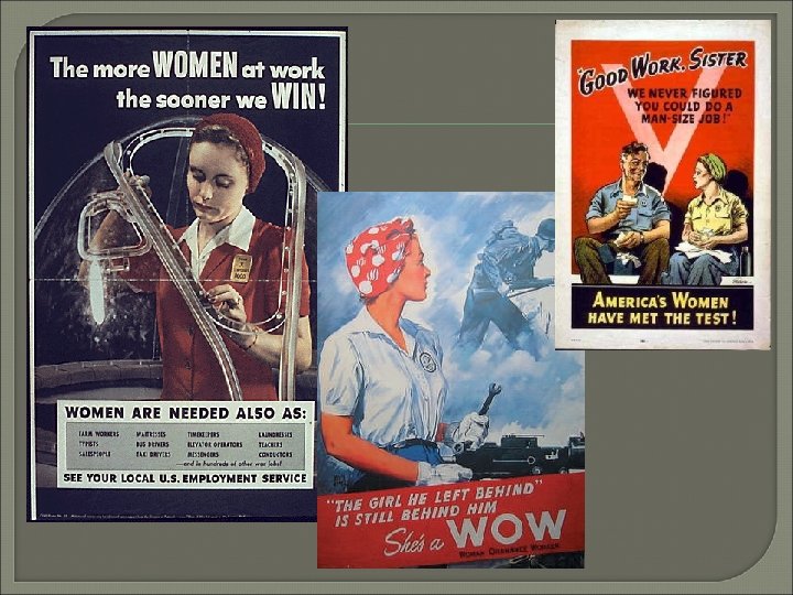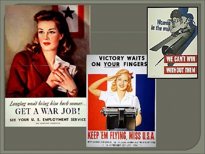 More Homefront Propaganda War Bonds weren’t the only way a person could help in the effort. As men left to fight, women took over the jobs in the factories. Rosie Riveter is one of the most popular posters ever created in the United States. Think about what the arm symbolizes. What about her facial appearance/expression?