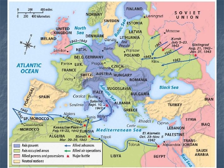 The Allied Offensive n North Africa (1942 -1943) n Summer 1942 – British forces pushed Germans back into Libya n n November 1942 – an American army landed in French North Africa n n n Swept eastward through Morocco & Algeria led by General George S. Patton Briefly stopped in Tunisia before Patton led impressive string of victories May 1943 - Rommel abandoned North Africa n n Ended threat to the vital Suez Canal 300, 000 German troops captured Italy (1943 -1944) n July 1843 – 250, 000 British & American troops landed on Sicily n n Sept. 1943 – Invasion of Italy began n Popular uprising in Rome forced Mussolini from power Italy then surrendered but Germany continued to pour in reinforcements Fighting intensified over the next nine months n n Staging ground for invasion of southern Italy Jan. 1944 – Battles of Montecasino & Anzio June 1944 - Rome liberated n April 1945 - Mussolini & mistress captured & executed by Italian partisans