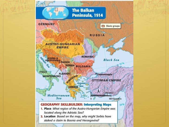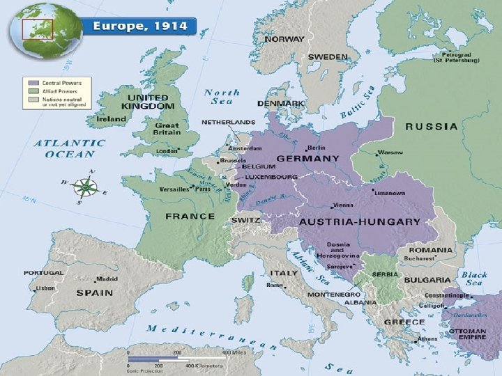 Basics 1914 -1919 - The “Great” War There were many existing tensions that contributed to the outbreak of war (MAIN), however, the immediate cause was the assassination of Franz Ferdinand. Triple Alliance (Central Powers-GM, A-H, OE) vs. Triple Entente (Allied Powers-FR, GB, RUS) War fought in: Western front, Eastern front, and in the Ottoman Empire First major conflict following the I Rev = high casualties and new fighting styles First “total” war It’s lasting legacy will lead to the conflict known as WWII.
